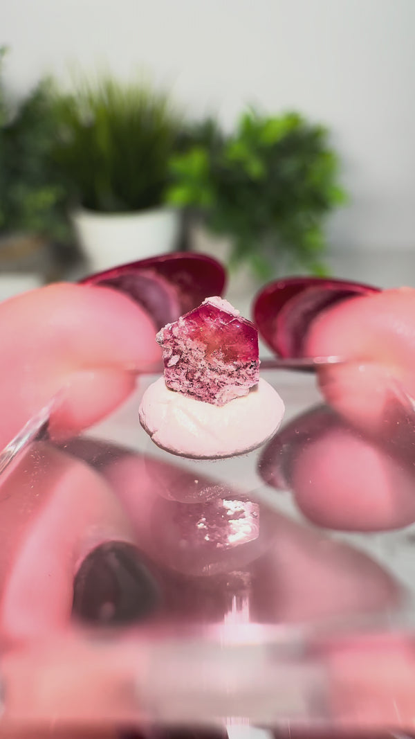Red Beryl/Bixbite aka Scarlet Emerald from the Thomas Range is a manganese-colored member of the beryl family, showing a natural raspberry-to-scarlet red hue within a true hexagonal crystal structure. The crystals develop in gas-rich rhyolitic cavities, which is why surfaces often show natural texture, tiny quartz coatings, or rhyolitic contact points.