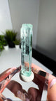 It shows classic hexagonal beryl crystal growth with natural striations and a well-formed termination. Color is light to medium bluish-green, caused by vanadium. Same beryl species as emerald — lower saturation, but naturally vivid and untreated.