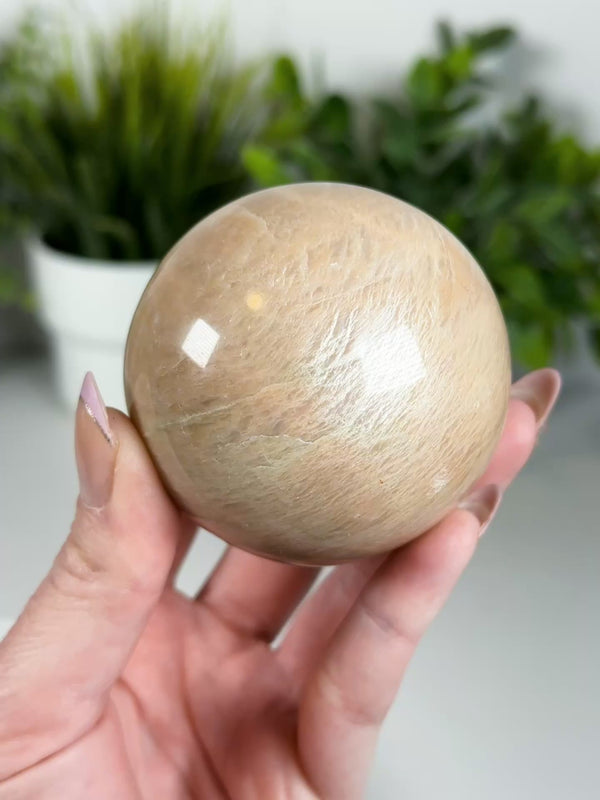 A stunning flashy peach moonstone polished crystal sphere from Madagascar! You will receive the exact sphere shown in the listing photo and video.