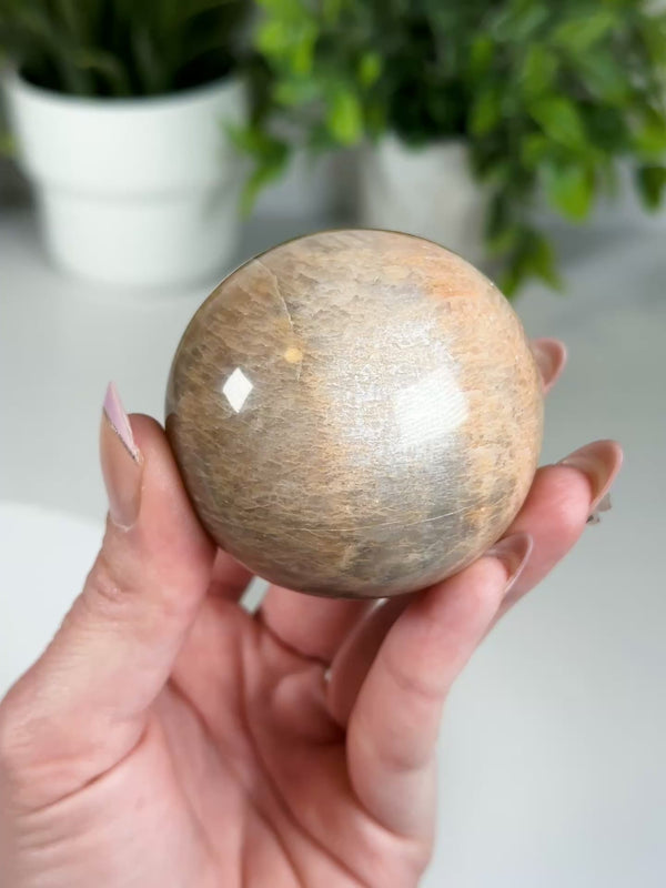 A stunning flashy peach moonstone polished crystal sphere from Madagascar! You will receive the exact sphere shown in the listing photo and video.